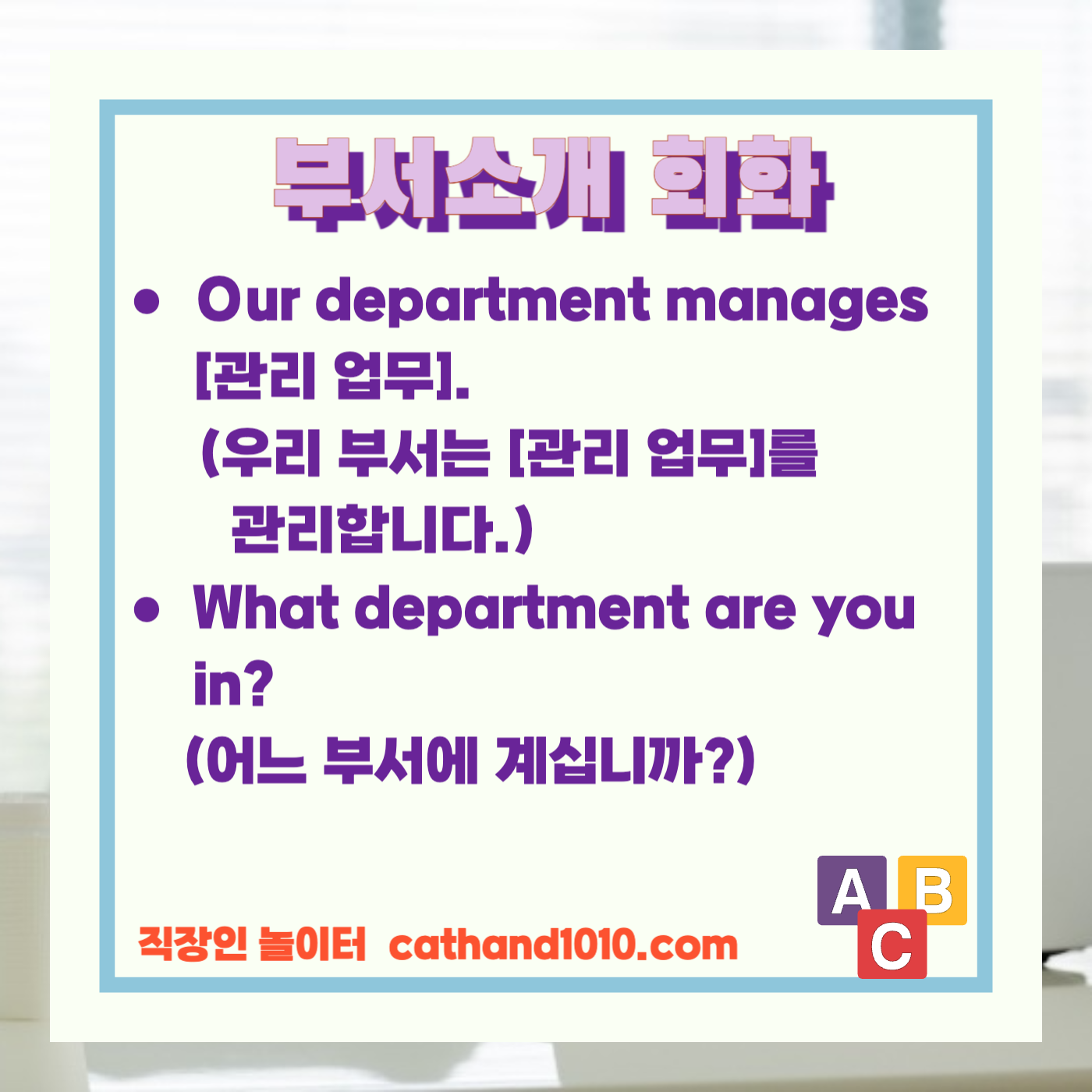 - 자신의 부서 이름과 주요 업무를 소개하는 핵심 영어 단어 5개 익히기